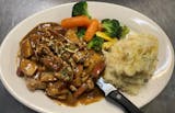 Served with mashed potatoes, vegetable & side chef salad with choice of dressing, bread & butter.